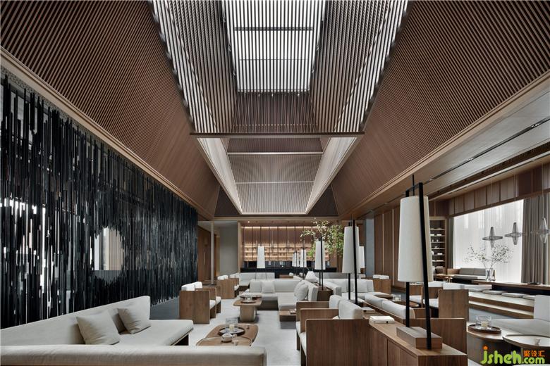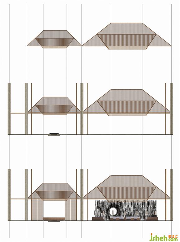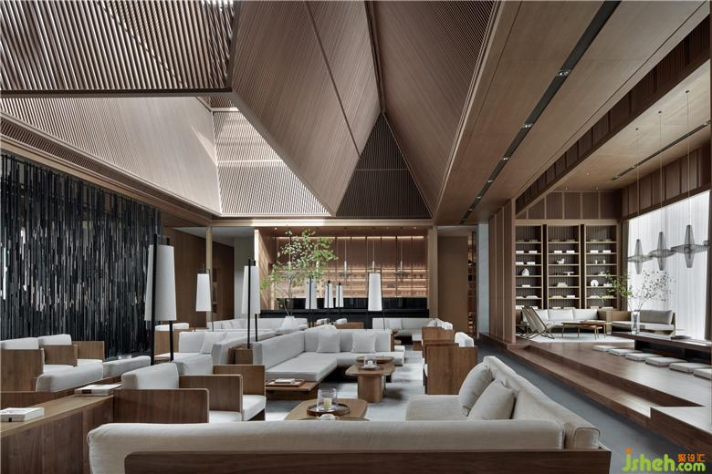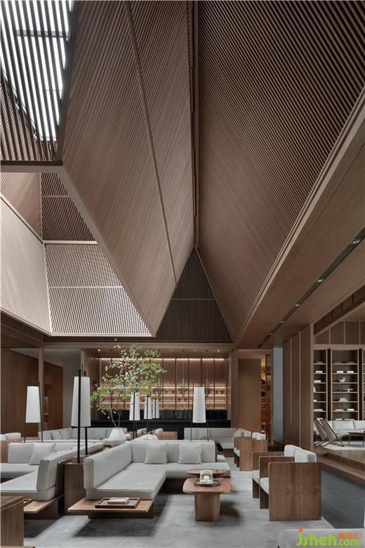 为了寻求“山水聚合、藏风得水”的传统建筑理念,空间中被并列地置入大型的木质构架作为整体建构和分割空间的主体骨骼造型,形成“舍”的框架结构部分。