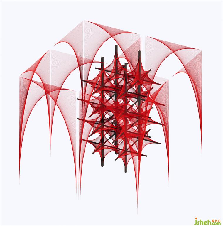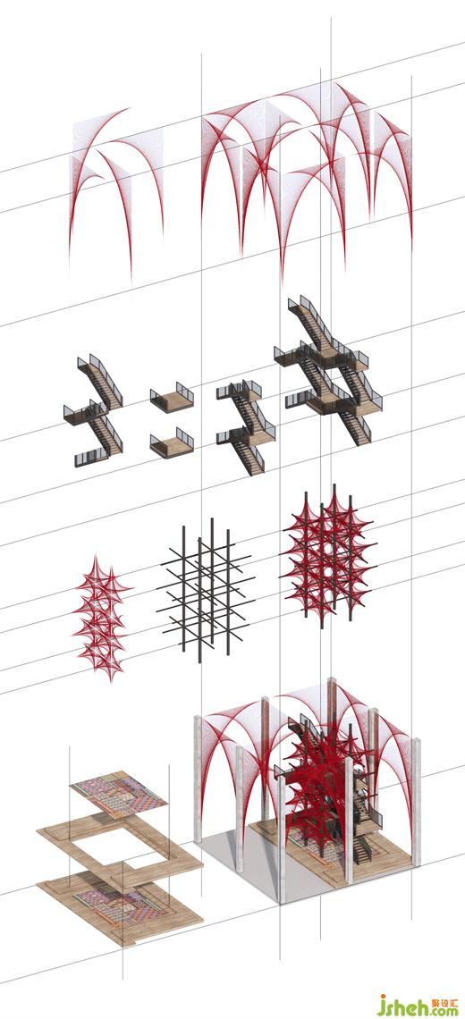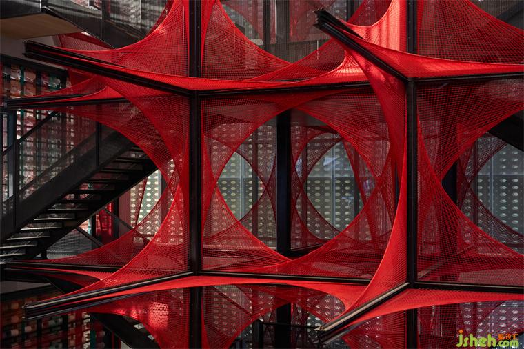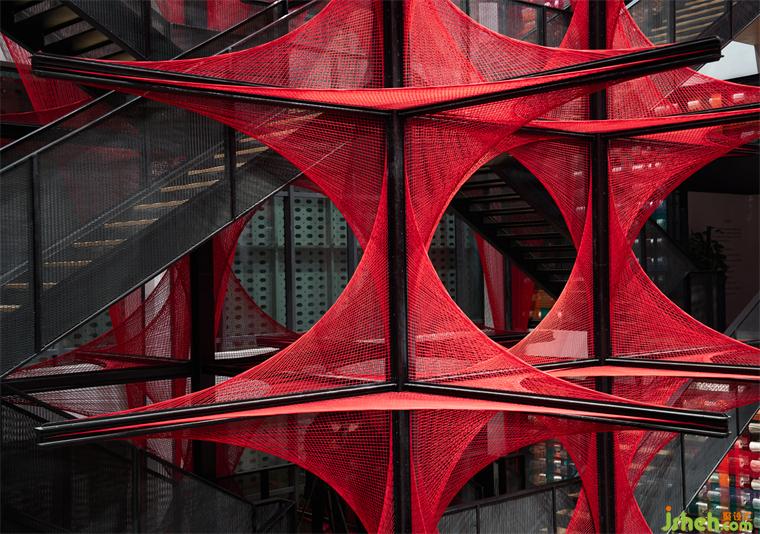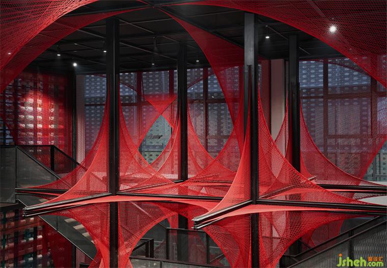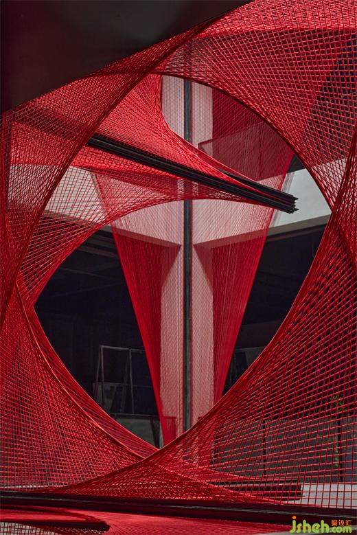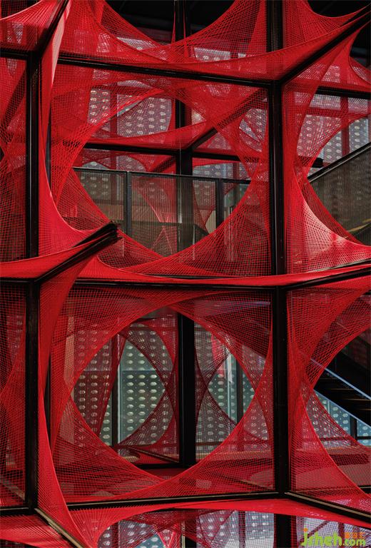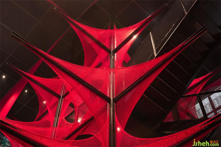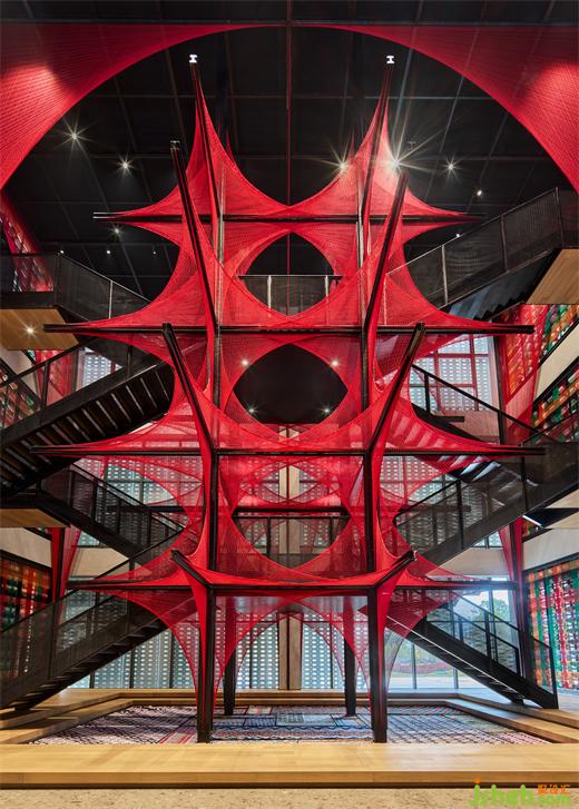 在原始场地14米挑高的空间条件下,风合睦晨将这种单面纹样做了一次象征性的三维展开——20根钢结构骨架横纵穿插,红色锦线依附钢架逐根牵拉、固定而成,艺术博物馆装修设计从织锦纹样中提取的菱形结构在正、侧、俯、仰的360°观看下清晰可见。