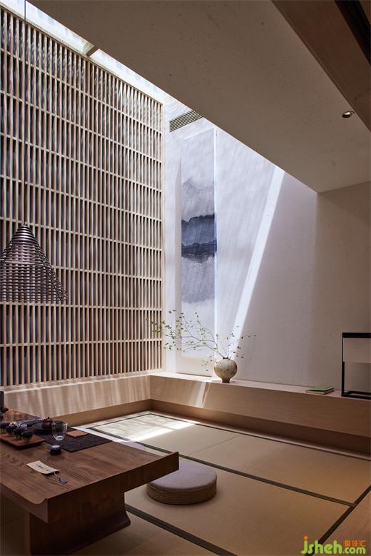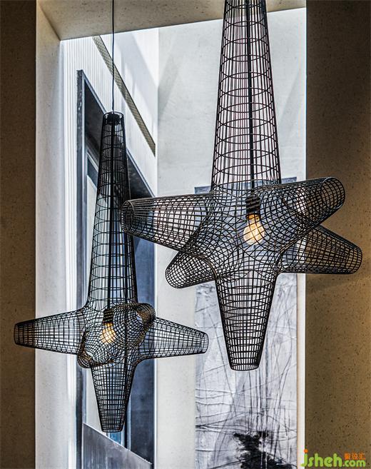 由此向内,不规则阵列的异形丝网灯由挑空的屋面垂下,细格栅由天花如瀑而下,作为条形茶台的背景,笔触简明有力。