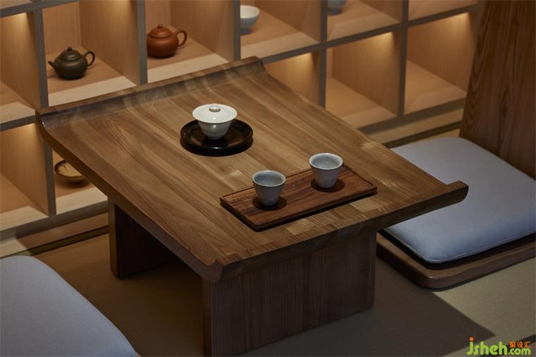 二层过渡空间以展陈为主,向内设回廊卡座,楼板由原来的2.3米向挑空处推进至3米,茶空间设计以获得落座区更为松弛的尺度。