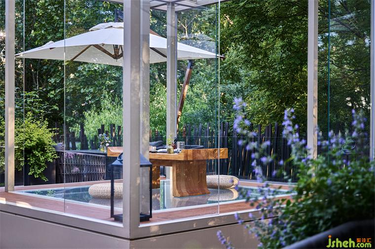 行至露台,设计师保留了原有的一方天窗,并在其上建玻璃茶亭,放置小几蒲团。丽都花园内已亭亭如盖,树冠环抱露台,茶亭之外,四季流转清晰可辨。年轻茶客络绎不绝探访茶亭,热闹之外,属于中国人精神向度里的人文性也一定在生长。