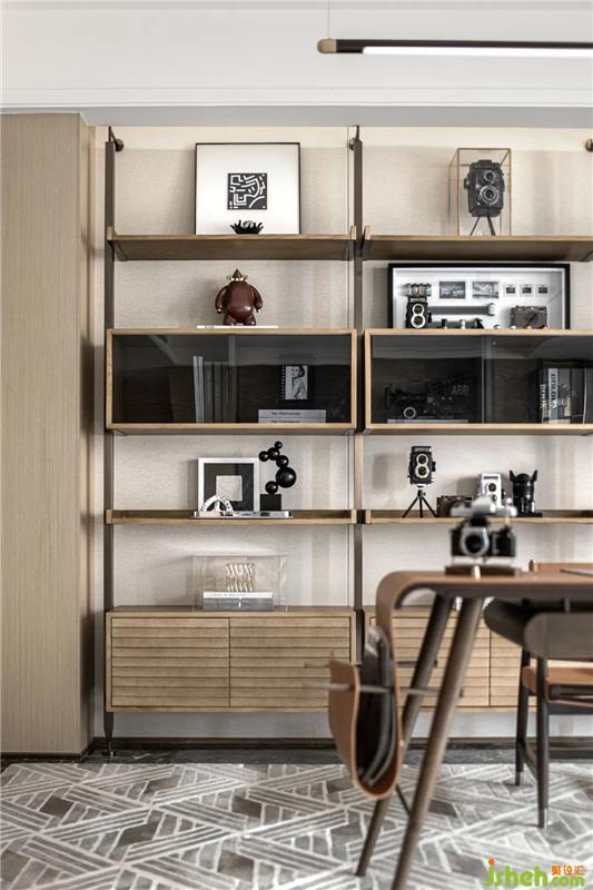 雅致的单人扶手座椅、抽象的艺术版画、翠绿挺拔的绿植,以自然的姿态走进居者的生活,映射出日常的充实与优雅的美学。一侧的工作区中,老式电话、艺术摆件、胶片相机等物件的装点,加之少许爱马仕橙的融入,勾勒出主人内心的个性与卓然的品味。
