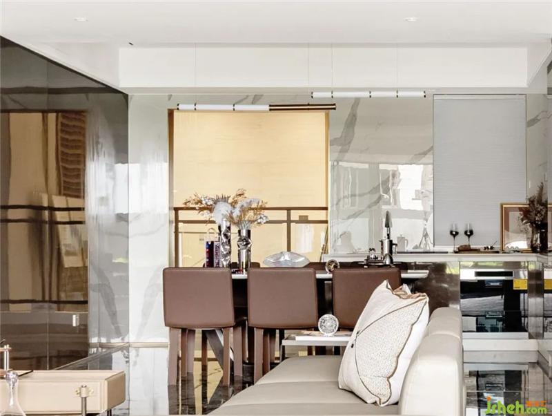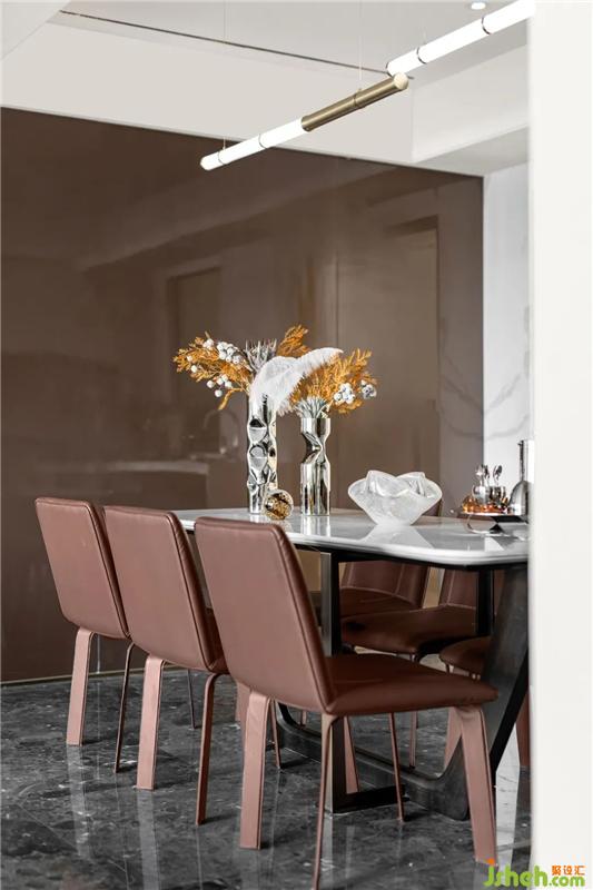 红棕色皮革餐椅与纤细艺术吊灯的组合,在大理石地面的映衬下,谱写着低调的奢华,透露出精致而时尚的就餐氛围。