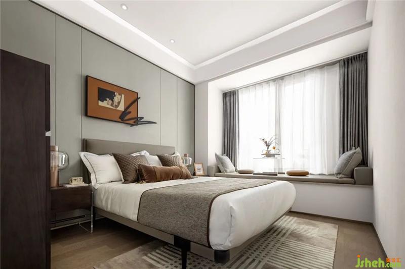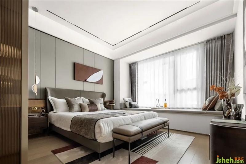 柔软的床头软包、具有光泽感的丝绒、精致的木制角柜串联起空间的雅奢气质,亦以丰富的空间触感,带给居者踏实而温暖的体验感。
