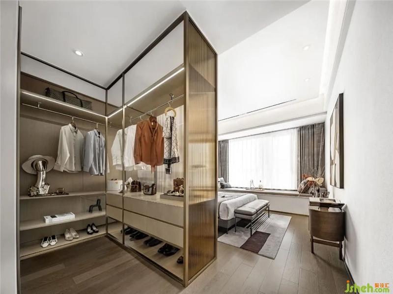 主卧延续爱马仕色系的成熟与稳重,搭配风格及造型相统一的地毯与挂画,构设出空间的整体基调。在拐角区域的留白处,设计师通过衣帽间的设置,赋予居者自由的动线体验,与都市人居的品质感相贴合。