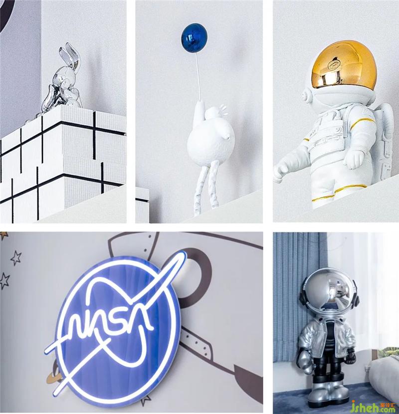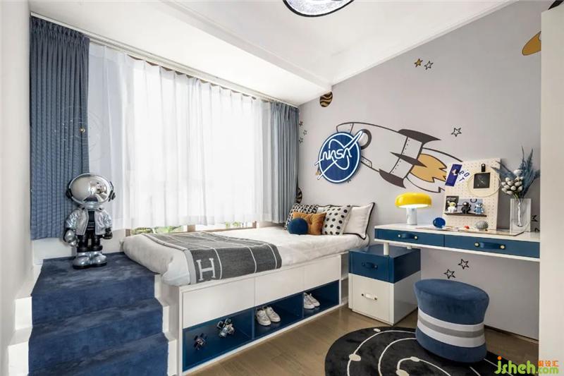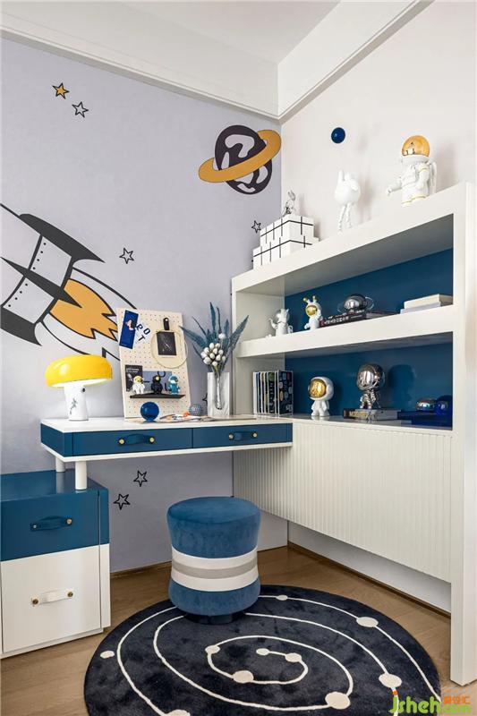 这里住着一个喜欢探索航空和宇宙的可爱男孩。其中蓝色的铺垫让空间充满着青春与活力,而极富创造力的墙绘与航空员摆件则象征着男孩独特的喜好与个性,这一充满童趣的氛围赋予了孩童充足的想象空间与创造力。