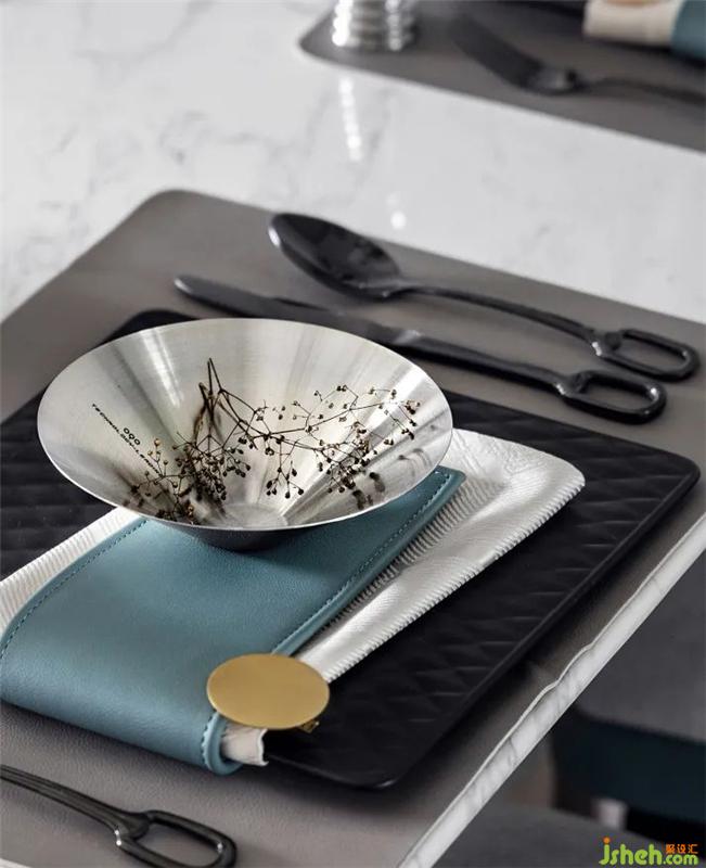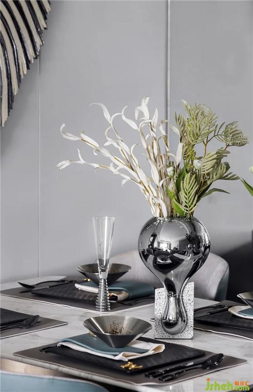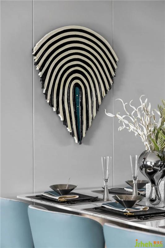 在餐厅的配色中,设计选用深青与雅灰,铺叙空间底色的当代质感。同时在细节的点缀处,黑白条纹的艺术装饰、环绕式金属圆环吊灯,以时尚精致的艺术表达,再次强化Art Deco的装饰性,恰到好处地表意着空间的精神内蕴与美学风度。