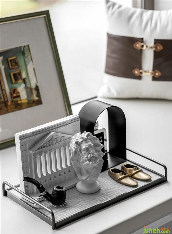 颇具质感的蓝色,加之木色与白色的穿插,调和出次卧沉稳高级的美学视感。同时在软装搭配上,墙面的同色系几何装置、桌角处的金属台灯与人物石膏雕塑,从生动的外部造型到内里的精神世界,丰盈着空间的艺术内涵,迸发出Art Deco鲜活的美学力量。