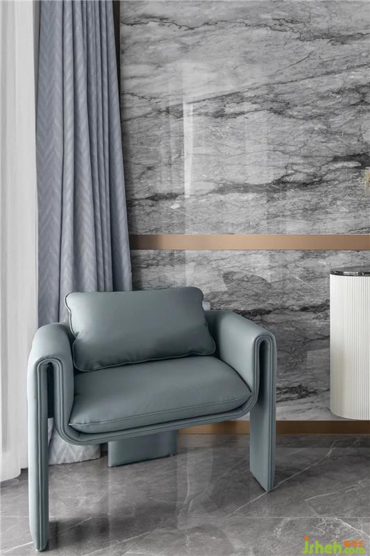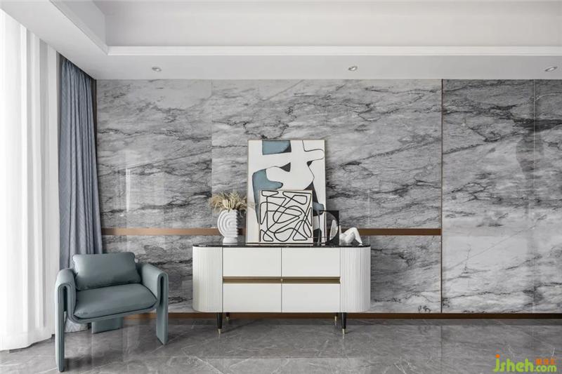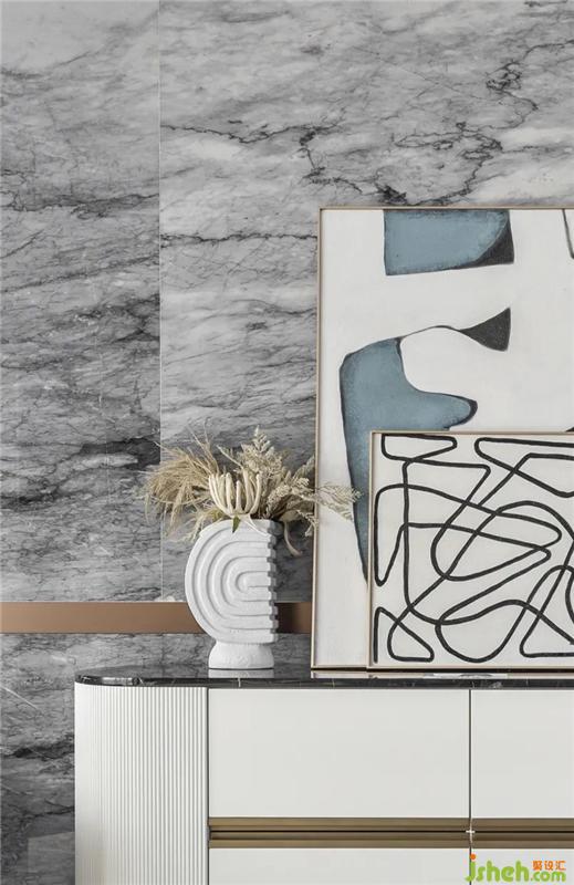 设计师在此思考如何通过细节的刻画,建立居者与空间的情感链接。在白调的基底上,毛绒的柔软沙发、抱枕的抽象条纹画、光滑明亮的理石等多种层次的美学叠加,在视觉与触感层面,调动起居者对于生活的丰富感知,实现崭新而自在的人居体验。