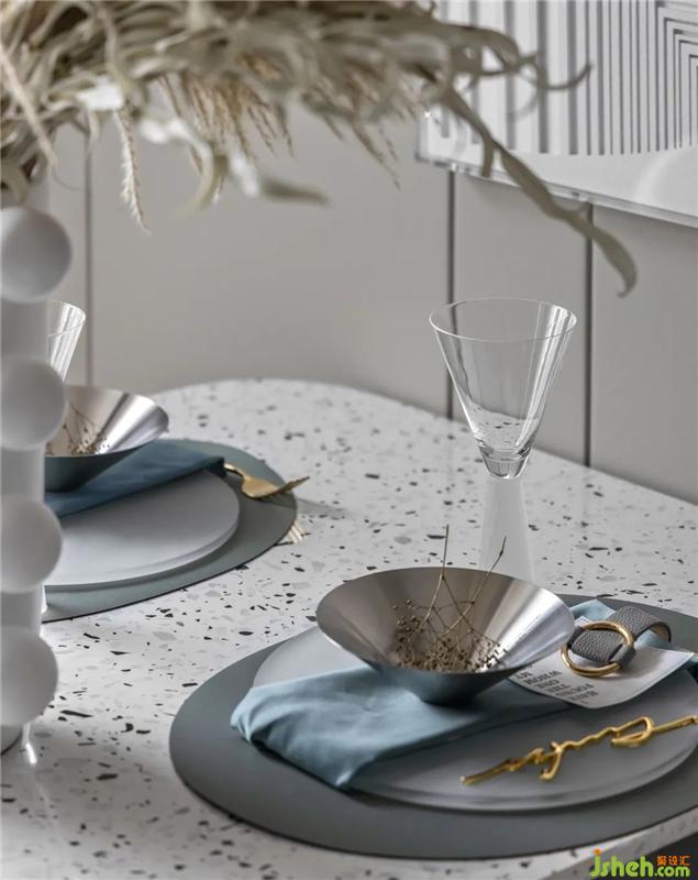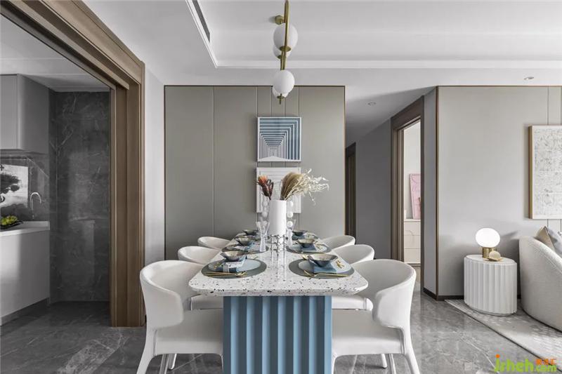 设计在餐厅中引入现代简约的美学精神,在延续白调的基础上,以低饱和度的蓝色系加以点缀,定义空间的当代主义风尚。细腻精致的金属、通透灵动的玻璃、有趣的几何造型,每一处设计都透露着空间精致的艺术美感,每一笔勾勒都描摹着优雅的场域气质。