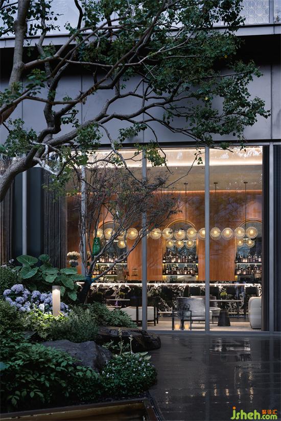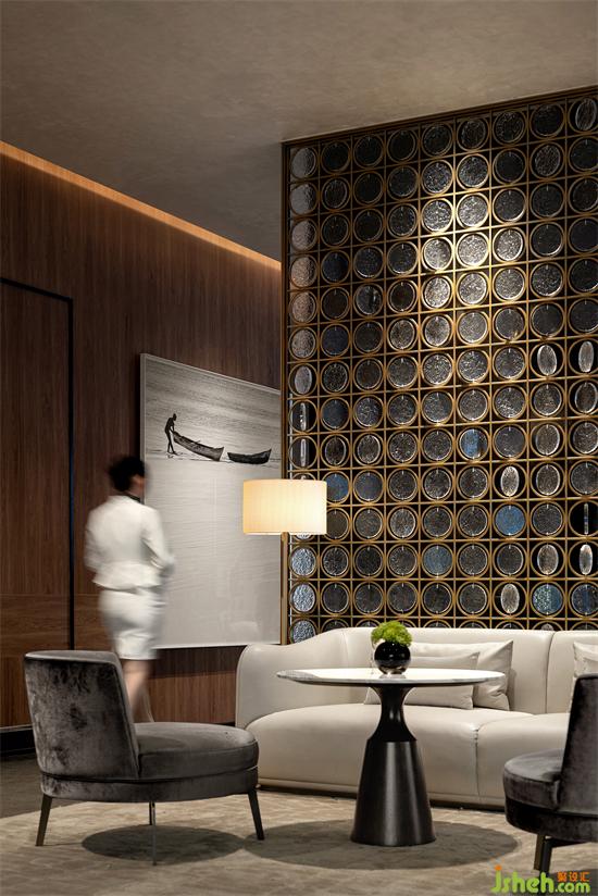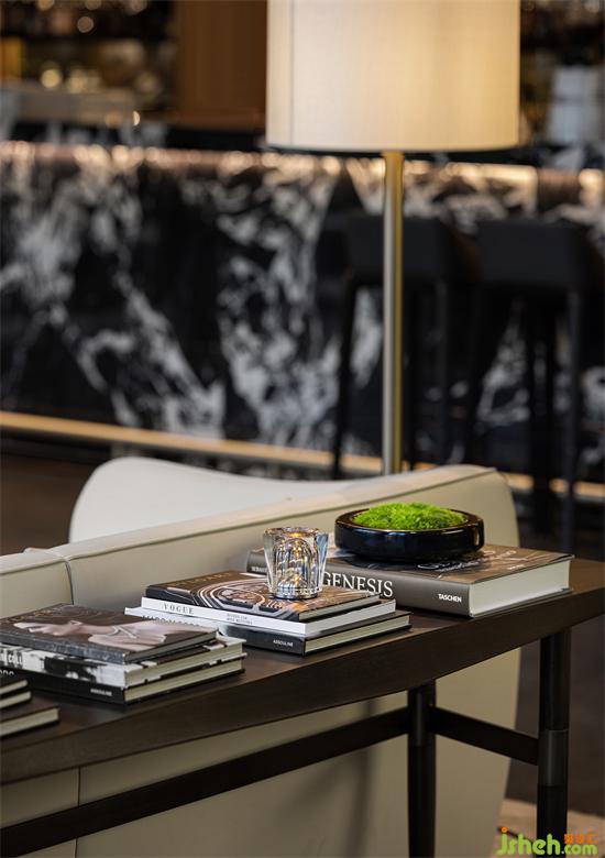 大面积的落地玻璃窗,使窗外引入的庭院景色自然渗透入室内空间,售楼处设计增加空间中的透气感。临窗而坐,带来置身宝格丽酒店的美妙体验。