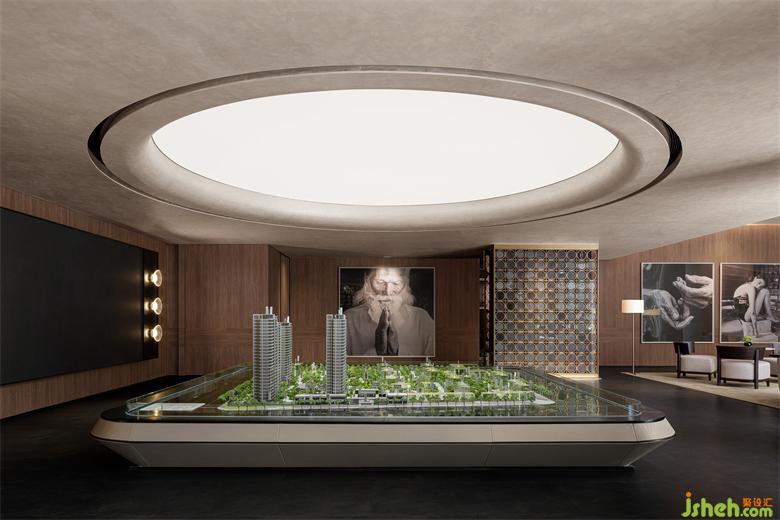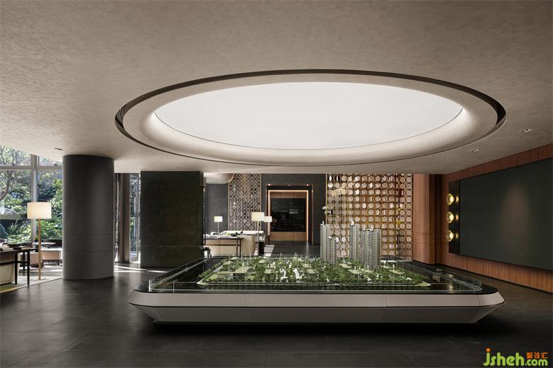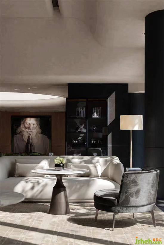 吧台一侧的洽谈区软装,整体采用与吧台相反的浅色调。售楼处设计米白色的沙发、地毯、茶几台面、落地灯,搭配顶面的弧形线条,共同诠释着空间中的舒适优雅的氛围。