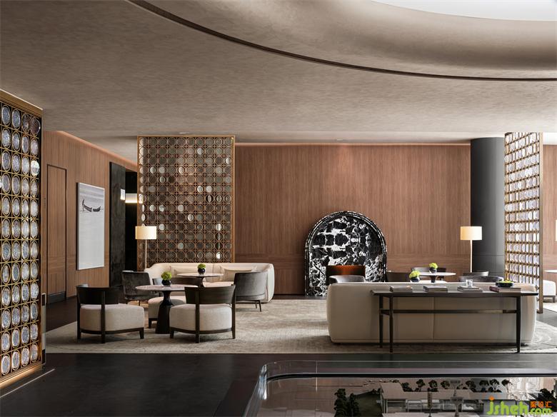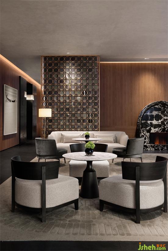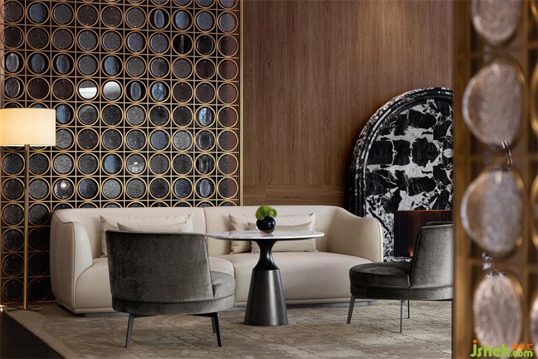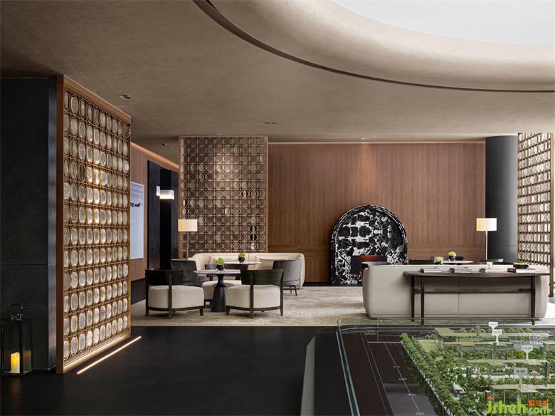 深色大理石的拱门型壁炉,售楼处设计复古雅致的木色墙面,敦实落地的座椅,被屏风柔化的自然光线,营造出一处奢华私密的深度洽谈空间。