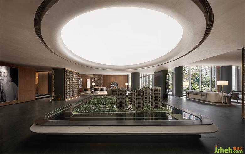 由沙盘区步入深洽区,整体没有封闭售楼处设计的空间,四周均以亚克力玻璃幕墙作为隔断。售楼处设计实现空间功能分区的同时,在视线上保持了空间之间的沟通,巧妙勾勒出一个会呼吸的自由空间。