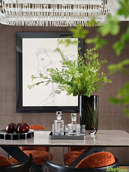 餐厅区的座椅面延续爱马仕橙的明丽,背部采用爱马仕经典的皮革工艺材质,样板间设计简洁利落的线条勾勒出时尚艺术的造型,与墙面上现代抽象的爱马仕主题装饰画相互映衬。