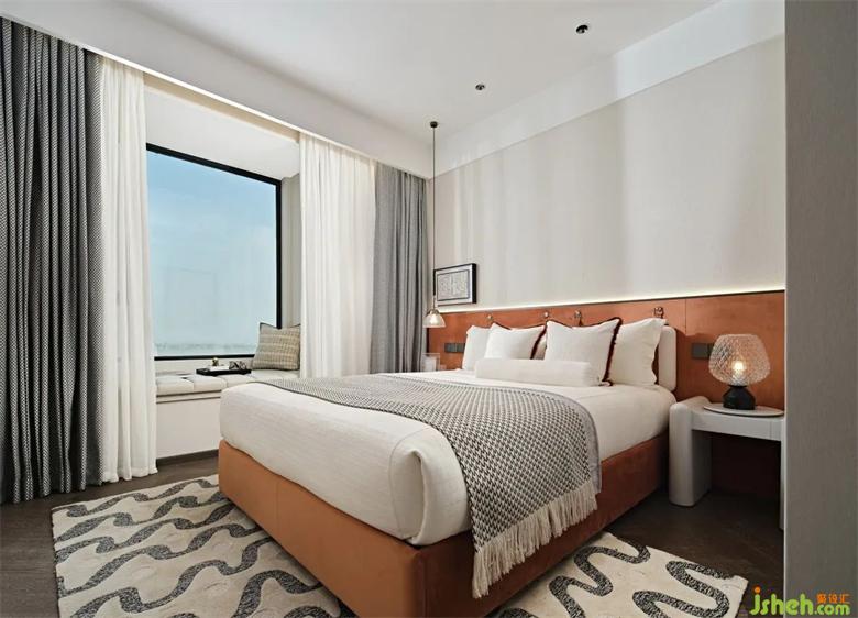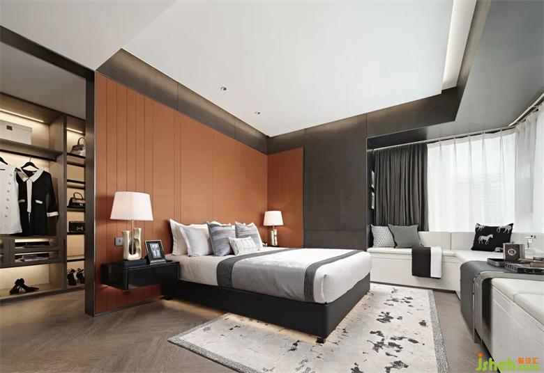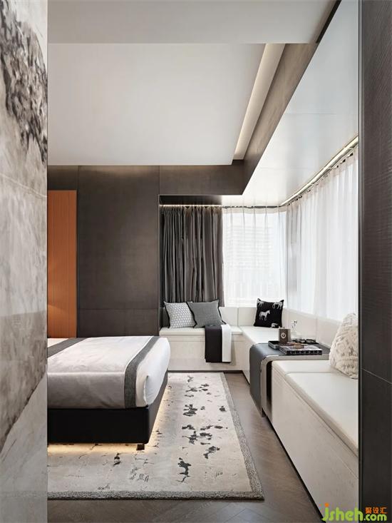 超尺度的主卧套样板间设计房,汲取精品酒店的套房空间设计灵感。L型大飘窗覆盖白色皮革坐垫,成为一处优雅舒适的转角沙发。闲暇时光,临窗而坐,读书、泡茶、发呆,回归生命最样板间设计本真的从容惬意。