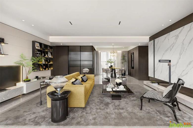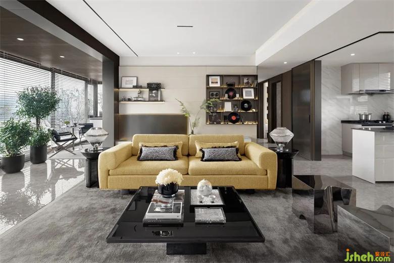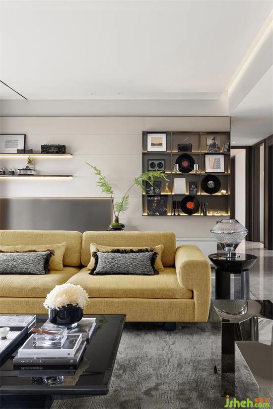 客厅以中性基调的黑白为主色,明黄色的沙发,及其背后格架上的黑胶唱片,为空间注入音乐的律动与欢快。样板间设计充分将艺术融入生活,结合收纳、收藏、演奏、观影等多样化的生活需求,演绎家的“ 音乐精神”。