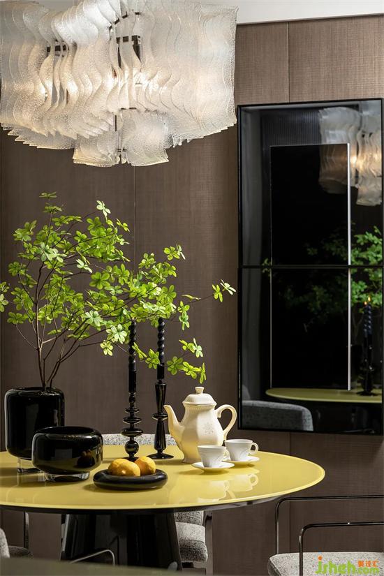 如千层折纸般轻盈的圆形水晶吊灯,简洁明亮的黄色样板间设计圆桌和黑色烛台,营造出浪漫优雅的用餐氛围,当饭菜的香气弥漫,自然成为家的向心力所在,承载生活最朴实的美好与温情。
