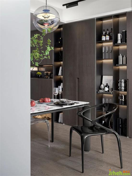依据年轻人的爱好与使用需求而人性化设计的简约开放式厨房,样板间设计黑白的岩板桌面和亚克力座椅,透明的球形吊灯,时尚现代。定制的餐边橱柜与玄关样板间设计柜连成一体,满足日常收纳需求,也完美利用空间,提升空间的视觉美感。