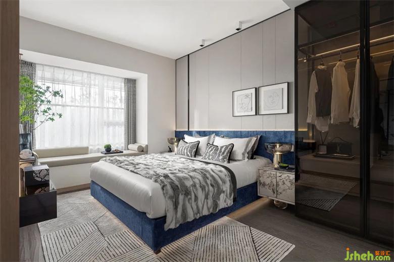 Yves Klein的蓝,总能赋予空间强大的艺术样板间设计生命力。精致柔软的蓝色天鹅绒软包床头,如大海和天空,大样板间设计自然中真实可见的同时也是最为抽象的东西。越是长久的凝视,越让人感到沉静,勾起无限的想象。