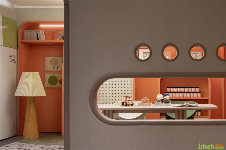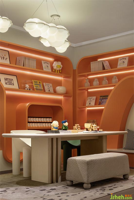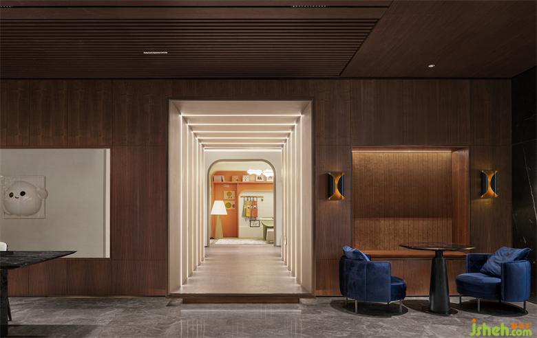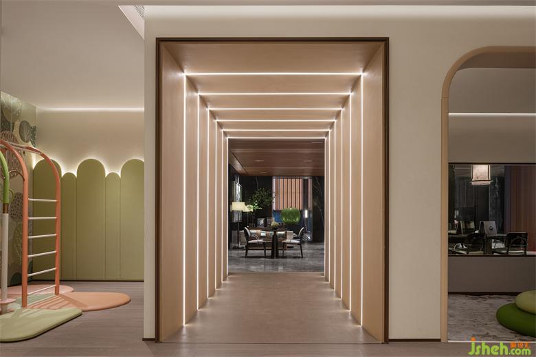 层层排列的灯带,打造出一条长长的梦幻光影长廊,通往明亮缤纷的儿童活动区。明与暗的强烈售楼处设计对比,也丰富了空间的层次感。