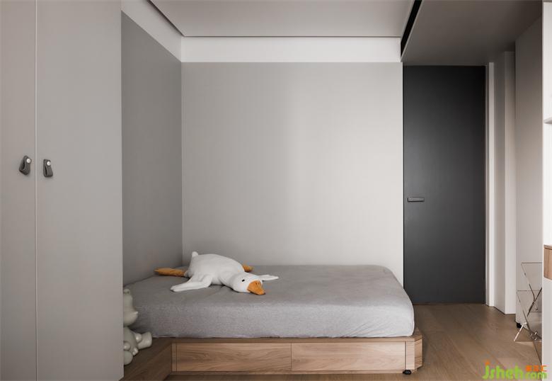 男孩房用灰色系打造,衣柜把手保留童趣。房间内设置书桌以及开放式展示架,可以摆放一些小男孩喜欢的手办或是书籍,家装设计既能做展示,又能丰富收纳空间。