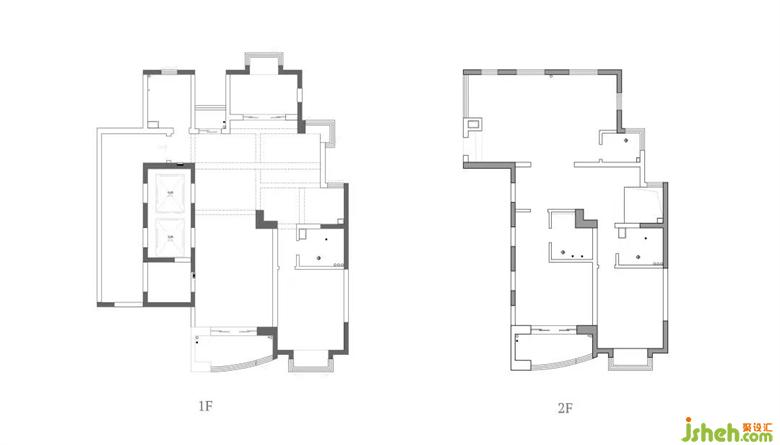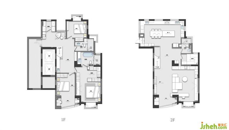 一层原始是公共区域,考虑到两个业主都是律师,会经常加班,所以调换一、二层的功能,将卧室区域放于一层,方便回家后能直接进入到自己的私密空间。整个二层一分为二,一侧是以客厅休闲为主,另一侧则围绕餐厅厨房展开。互换功能后,二层原始墙体都过于封闭,家装设计需要打开墙体重新规划成一个通透的空间。这样既方便了生活动线,又在空间上形成了交互互通,不同功能区域之间彼此独立,又有着贯通的流动感。