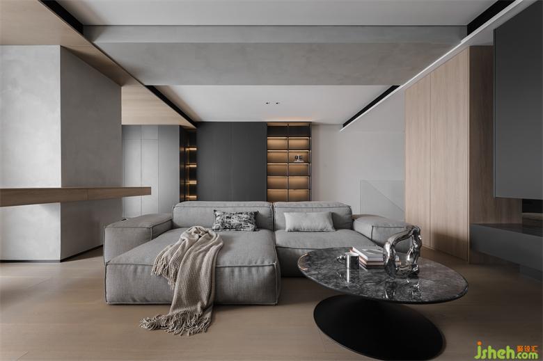 整体空间以经典黑白灰加以原木色为主题配色 。Living Divani 的定制款沙发是整个区域的核心,搭配十二时慢的艺术感茶几,呈现出鲜明有力的表现力,主宰了空间的第一印象。黑色、木色不同纹理的门板搭配上镜面给人带来的呼吸感,家装设计不规则的设计中又有着规则的舒适度。收纳功能也在隐形中得到了提升。