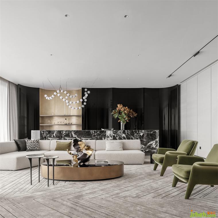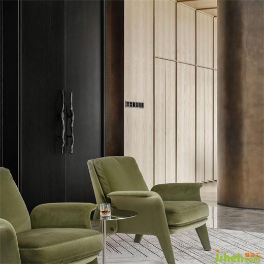 一旁的Meridiani茶几,圆形镜面与复古黄铜围边,私人别墅装修设计自带历久弥新的优雅气息。与之相对的一双Minotti绿色调座椅,微微向外翻转的扶手设计,提供了更为休闲的惬意与舒适。