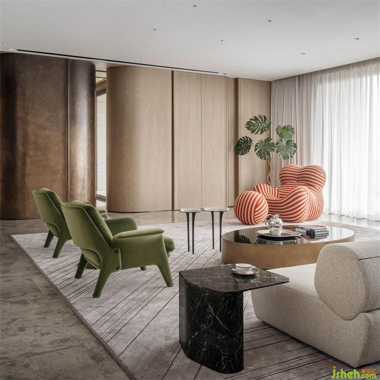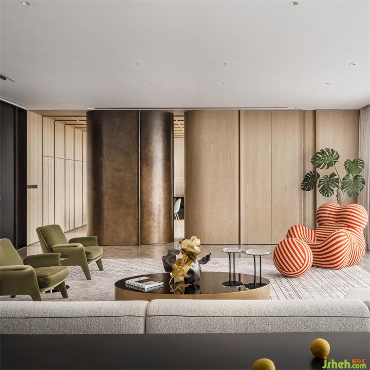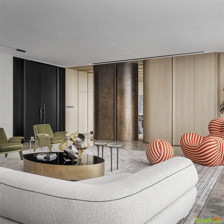 走廊的一侧是独立衣帽间的入口,椭圆天花设计与弧形搁架,在呼应间层层延展开来,温柔的大地色配以BAXTER毛绒座椅,营造华丽松弛的质感。
