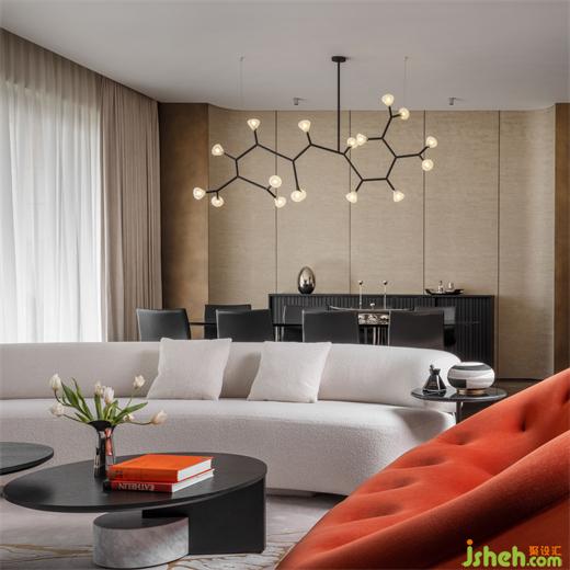 上行一层,抵达家中的客餐厅,米灰色系为主调,圆形地毯与茶几围出亲密聚合的意味。Gogan系列长沙发来自MOROSO,现代感流线设计与CASSINA单人座椅相应和,如同柔软的雕塑,轻盈有型。私人别墅装修设计而Ligne Roset沙发却以橘色宣告个性,鸟巢般的造型更平添舒适质感。此间MOROSO的金色三脚边几以不规则拼接元素凸显出自然形态与设计美学的结合,趣致盎然。Tom Dixon的香氛,更让家中空气有迹可循,捕捉五感开启的确幸。