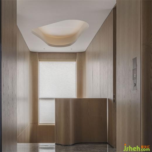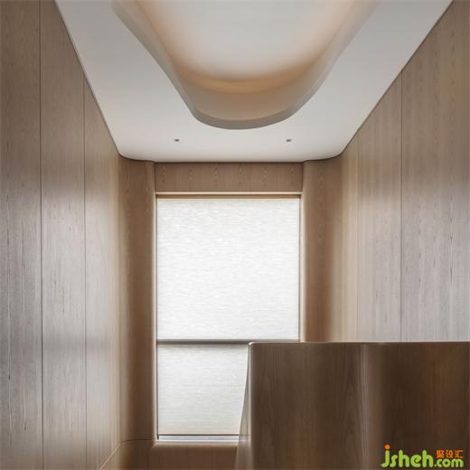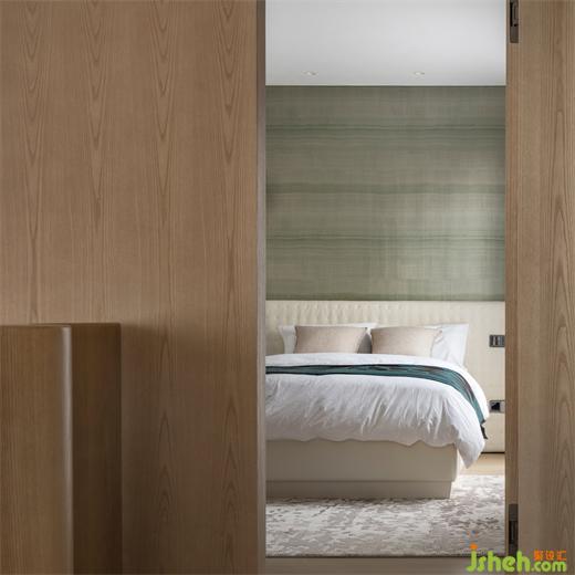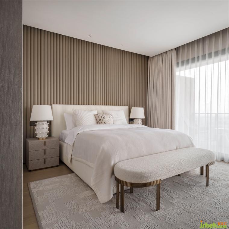行至二层是卧房区域,木与白色的主卧空间,颇有美学中“见白非白,私人别墅装修设计白由心生”的境界。立体起伏的背景墙面配以Kelly Wearstler台灯,底座的雕刻亦在有趣与精致之间形成诙谐对比。