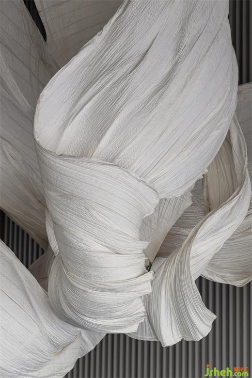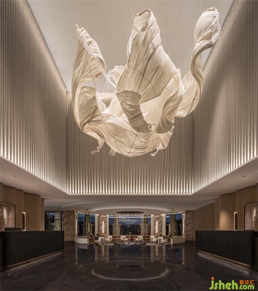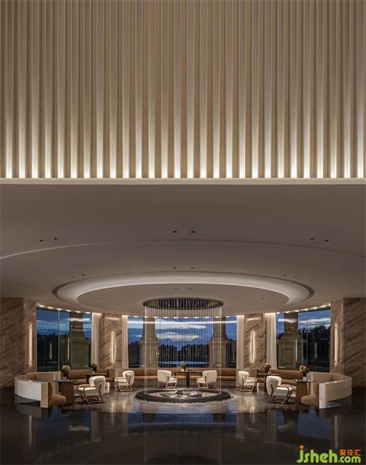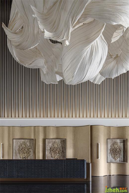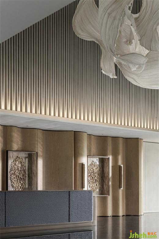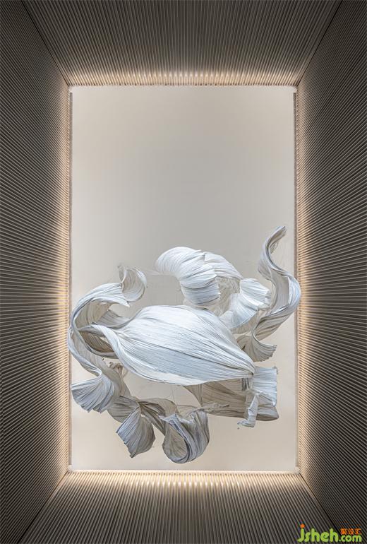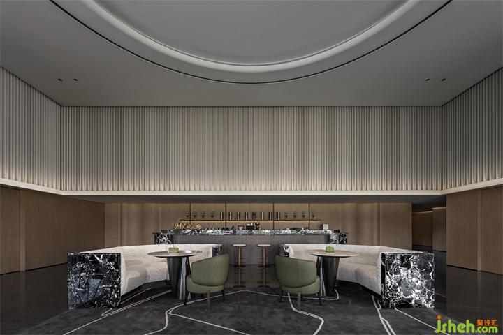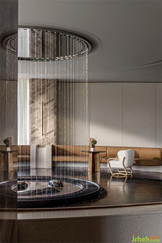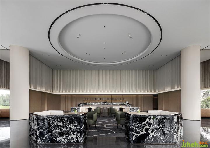 遵循原始空间的中轴对称与环形形式,擒纵高尔夫运动的动态意向,MDO以抛物线为灵感,体验中心设计将入口视作起点,将击球后的高飞刹那定格于接待中心。《雾屿》装置幻化出超然于任意球体的清澈灵动。墙体的立面曲率与悬挂的装置曲率相平衡。墙壁的雕塑性、延展性,为空间带来了更为软性和流动的感官体验,与地面石材的坚固物质性形成鲜明对比。装修设计