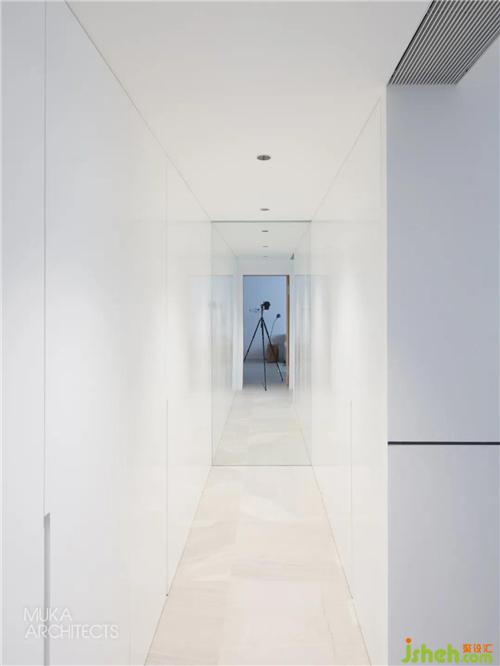 高处的镜面起到很强的视觉延伸效果,模糊并重塑了空间的界限,镜面代表了水,亦蕴含着他们入世生活中的上善若水。
