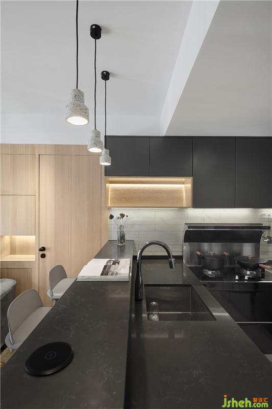 ▲餐厅吧台和灶台一体式设计,便于交流沟通。吧台的电动升降插座,支持无线蓝牙充电。