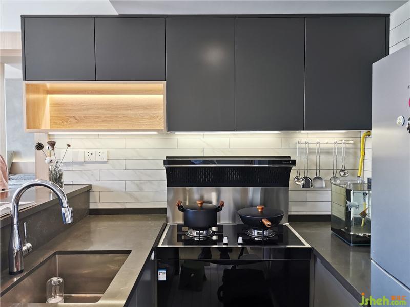 ▲集成灶可以提高排油烟的效率;橱柜吊柜手扫感应灯,方便开关,同时提升台面照度。室内设计师