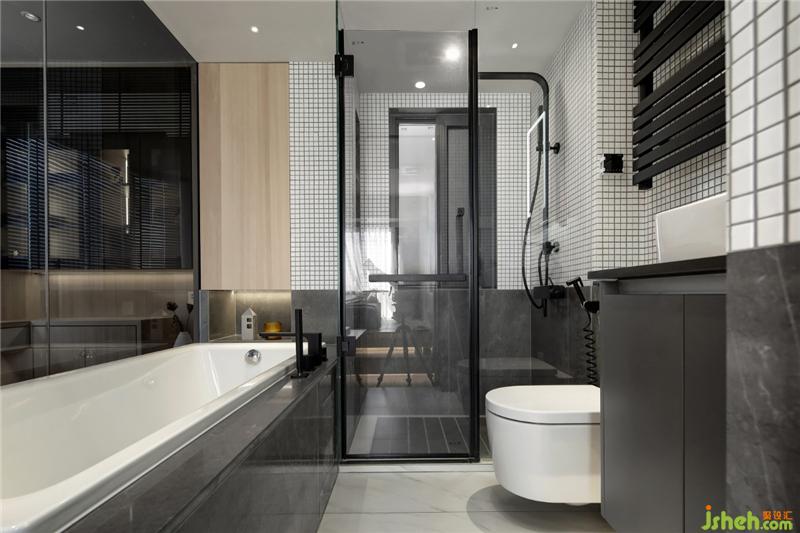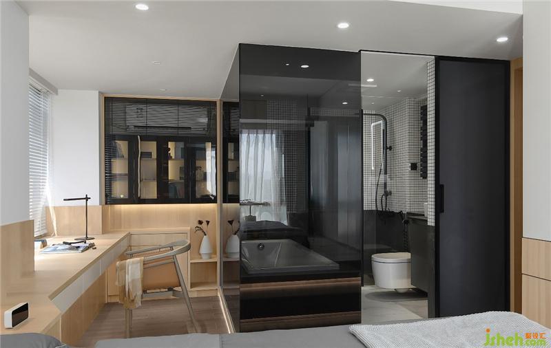 卫生间作为一个独立的盒子设计,打破传统的隔墙,改为黑色玻璃,强化区域界线的同时,也提供了视线交流的可能性,不同空间呈现出不同的生活情境,且能够视线无遮挡的交流沟通。半通透的黑色玻璃,方便清洁的同时,让卫生间增加了一丝神秘感和情趣!