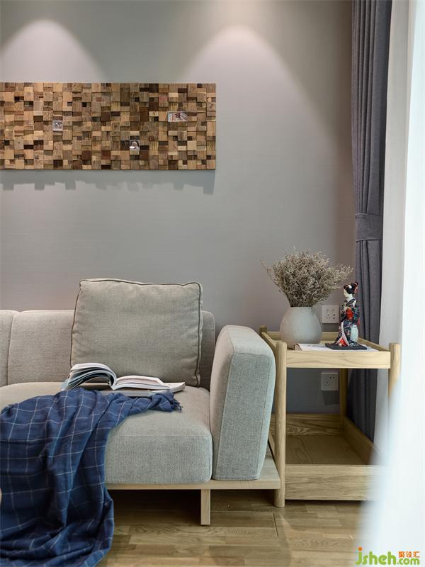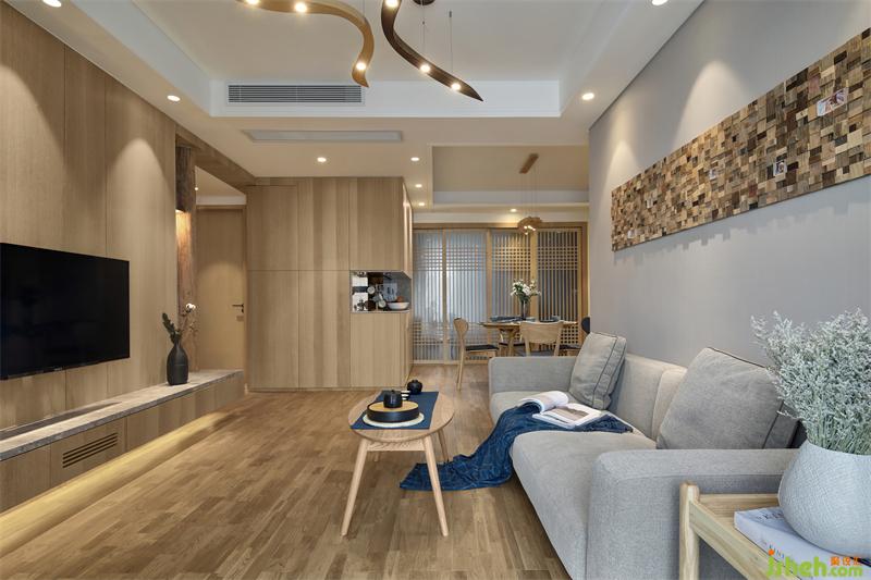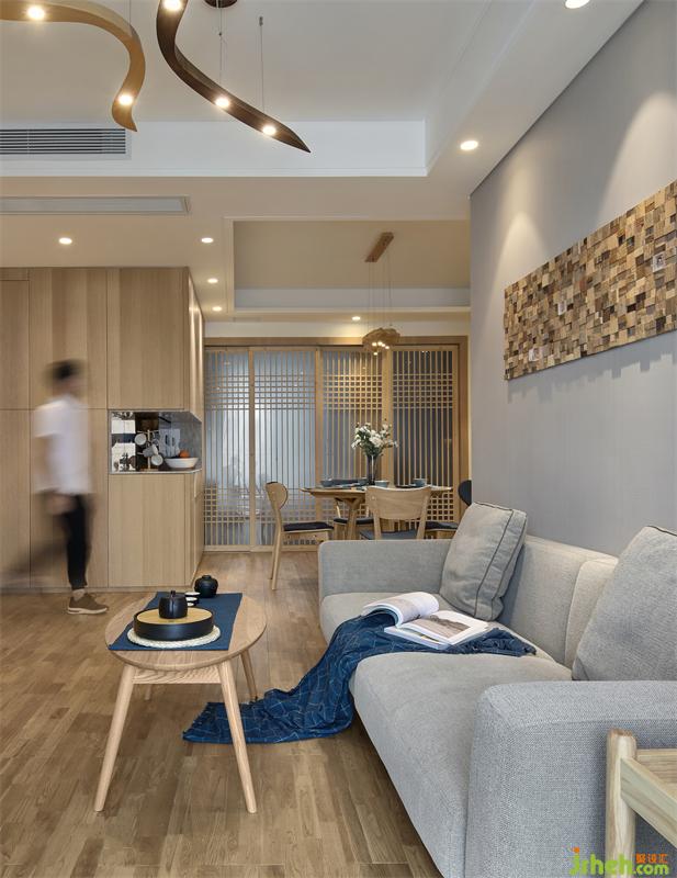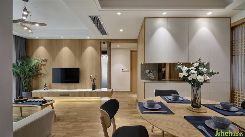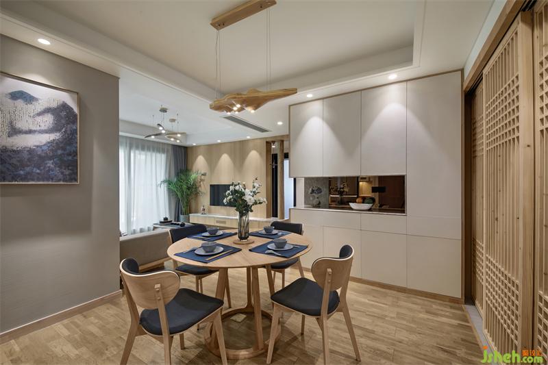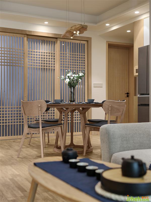 餐厅区域和客厅是两个方形空间错位连接,柜体的设计靠墙是最节约空间的方式之一,正好可以利用此格局,依墙设计L型餐边高柜、收纳柜、冰箱、烤箱的位置。客餐厅收纳的问题解决了,但是由于收纳柜多了很多,餐厅的空间通透性却减少了。如何扩大餐厅的通透性、同时让整个空间所需要的日式风格能够很巧妙的呈现出来?