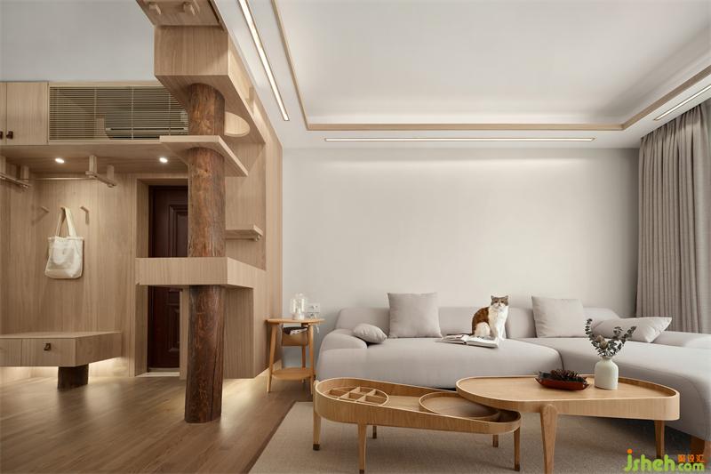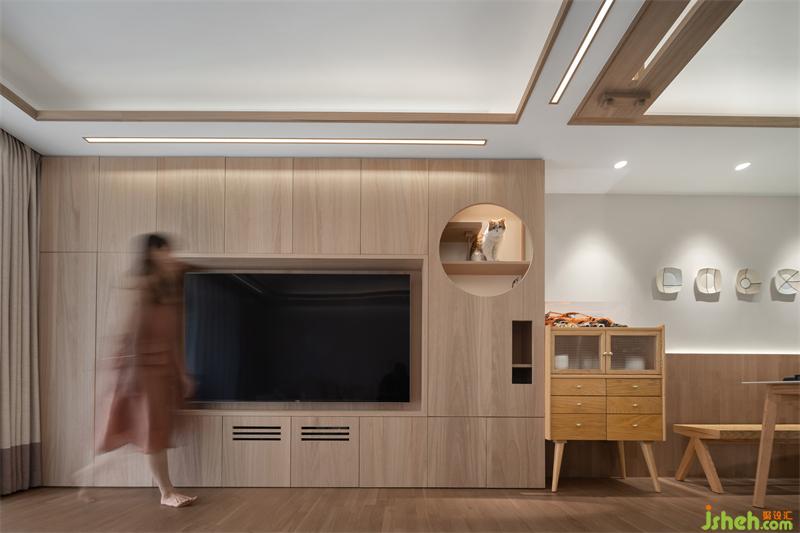通过这些元素,我们把空间从三维角度来分析,设计出两条动线。天花墙面就作为猫的活动区域,猫可以漫步游走其中,飞檐走壁,跳墙越城。人的活动行走范围界定在地面。猫的行走动线和空间的功能设计进行结合,玄关柜既是收纳功能,又是猫爬架的跳板;天花吊顶既是空间的设计展示,又是猫的行经路线;电视柜既是功能的考虑,又是猫休憩的场所。我们通过猫的行动路线作为一条线,贯穿所有的功能空间。