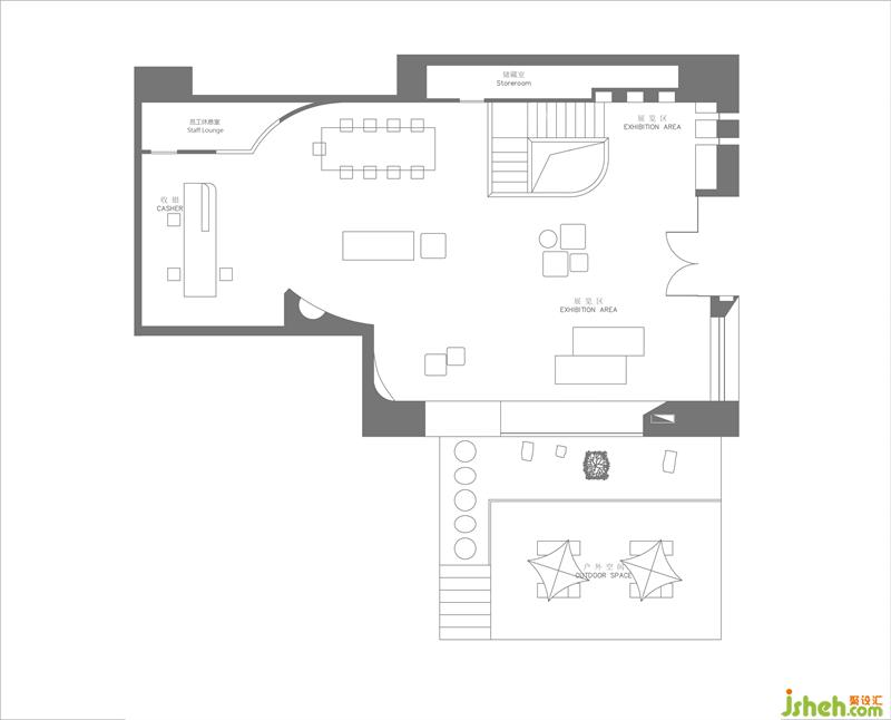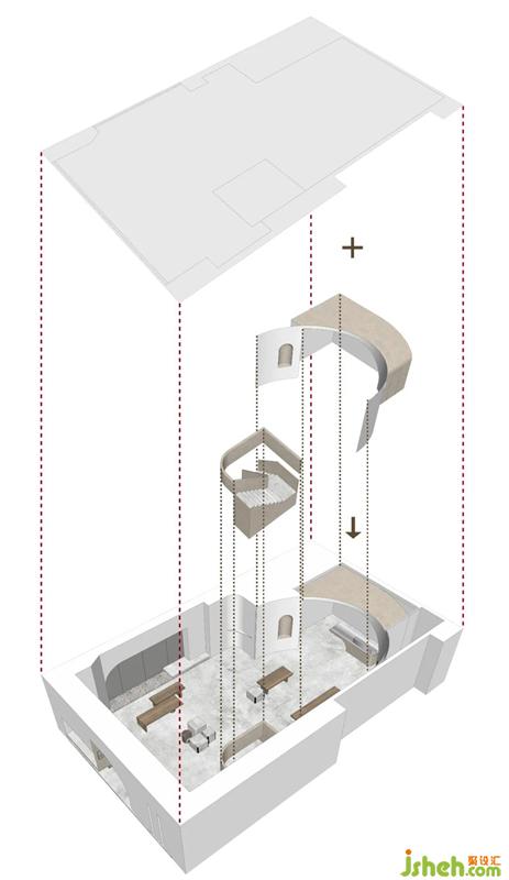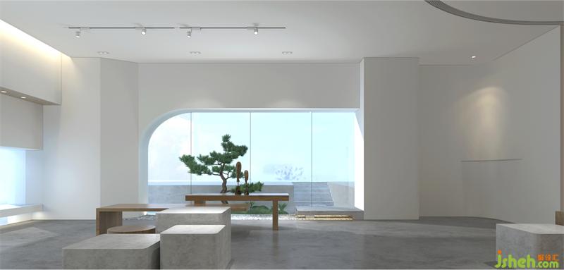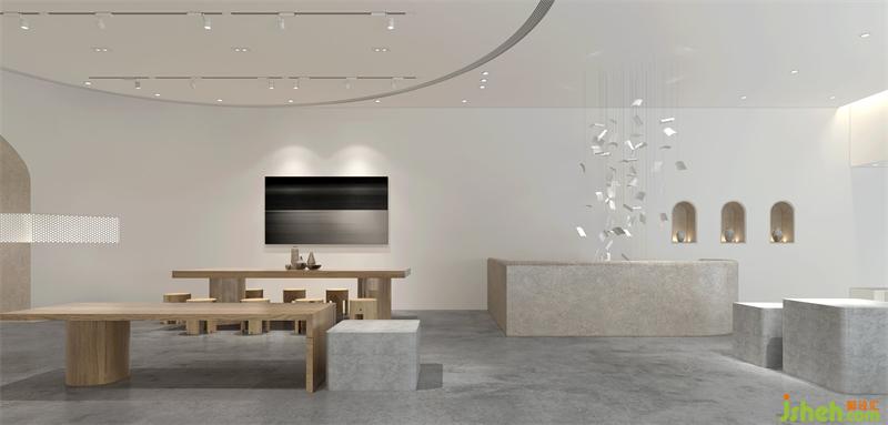 运用几何的韵律美感,透明,穿透的构成形式,塑造自由流动的空间形态。半弧形的曲线,塑造出一个柔软旋涡的空间,利用虚拟的界限,空间与空间形成流线型的体验,同时界定不同功能属性。在声学上,半弧形区域还能对声音起到收敛效果,增加其私密性。透过大厅玻璃,庭院景观可以无障碍的进入室内,让室内外形成对话,丰富了色彩和画面。展陈方式主要是通过不同组合形式的展台呈现,展台的组成可以根据不同的展示需求作灵活的调整,墙面点缀的造型孔洞,构成了空间的立面构成关系,可作为重要艺术展示窗口。