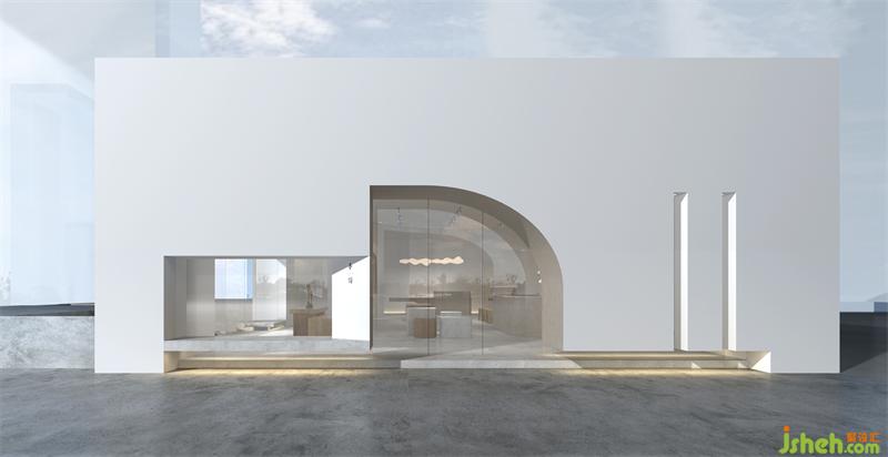 “容”可以解读为容器,器物感空间形态;也可作包容,不同的作品,传达不同的生活解读和艺术价值观。室内通过“容”的概念语汇来传达出区别于传统的艺术空间。设计师希望通过純粹的几何形式,表現出现代建筑语言及流动性的概念,打破传统空间规则,以及墨守成规的模式性。人自由的游走于其中,不同的视角和曲面维度。利用白色的墙面作为底色,产品可以非常自由的组合呈现,构成不同的画面感。空间的塑造过程中,剔除多余的元素。尽可能的回归到本质,让展品和流动的人成为主体核心。
