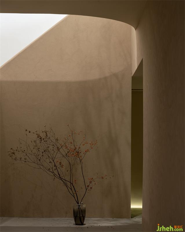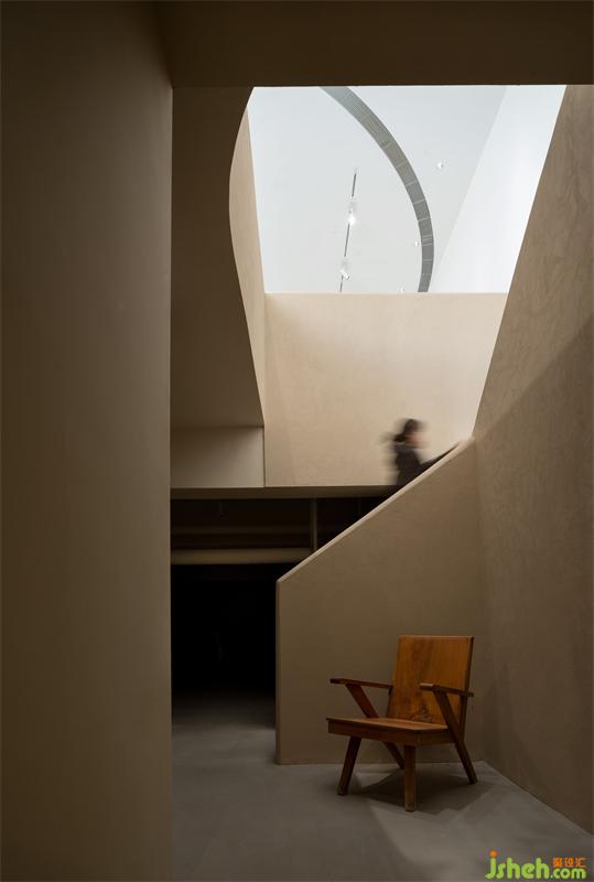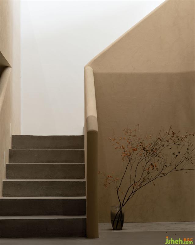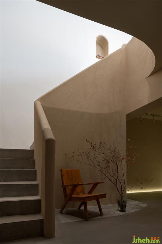 土黄色的艺术涂料包裹着楼梯空间,宛如从地面生长出来,展厅设计曲面的造型让粗犷的墙面柔和了许多,在光影作用下,如雕塑搬的存在。