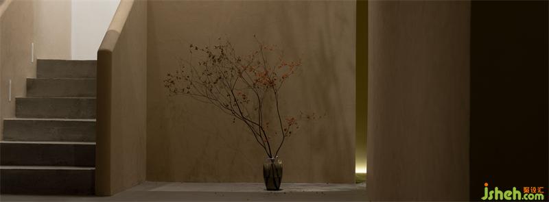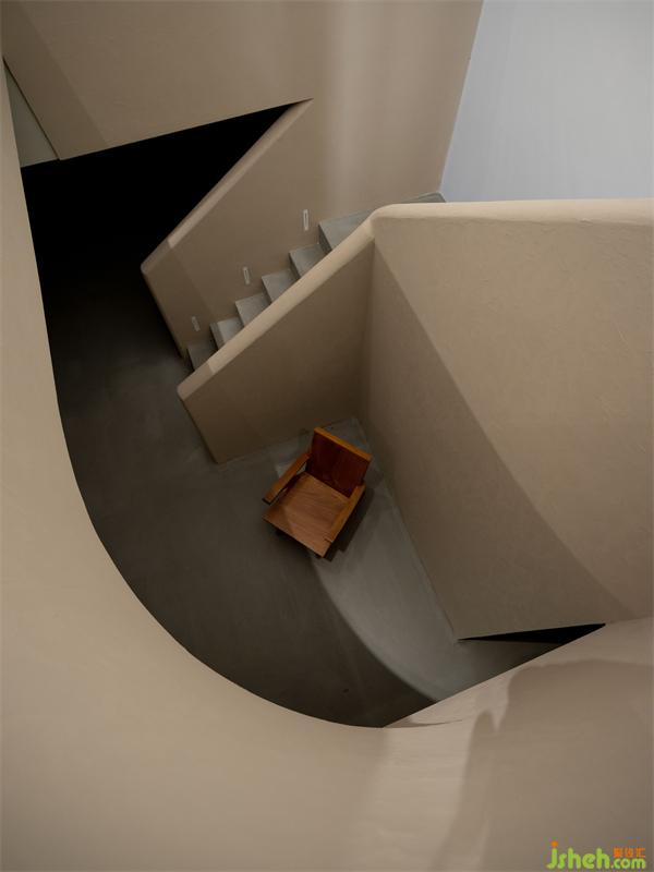 米色的半弧形楼梯延伸到负一层空间,粗糙的表面让空间多了一丝的朴素和神秘感。负一层主要是作为画廊展示空间,整体氛围设计为偏暖色调的暗空间,墙面和天花没有作过多的装饰,通过米色艺术肌理涂料,使空间呈现出原始的质感。