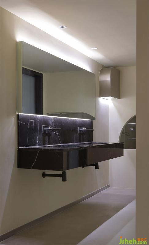 卫生间黑色的大理石台面和环境形成强烈的材质对比,强化它的存在感。