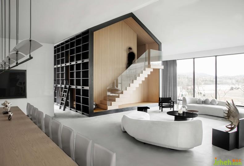 这个相对自由的白色空间,连结着窗外的自然环境和黑色的内层空间,带有过渡性质和半户外庭院似的轻松氛围,可以看作是类似内部一样的外部空间,和类似外部一样的内部空间。而内层空间完整的房屋形态和延伸出来的楼梯,更加强了这种“模糊室内外”的用意。