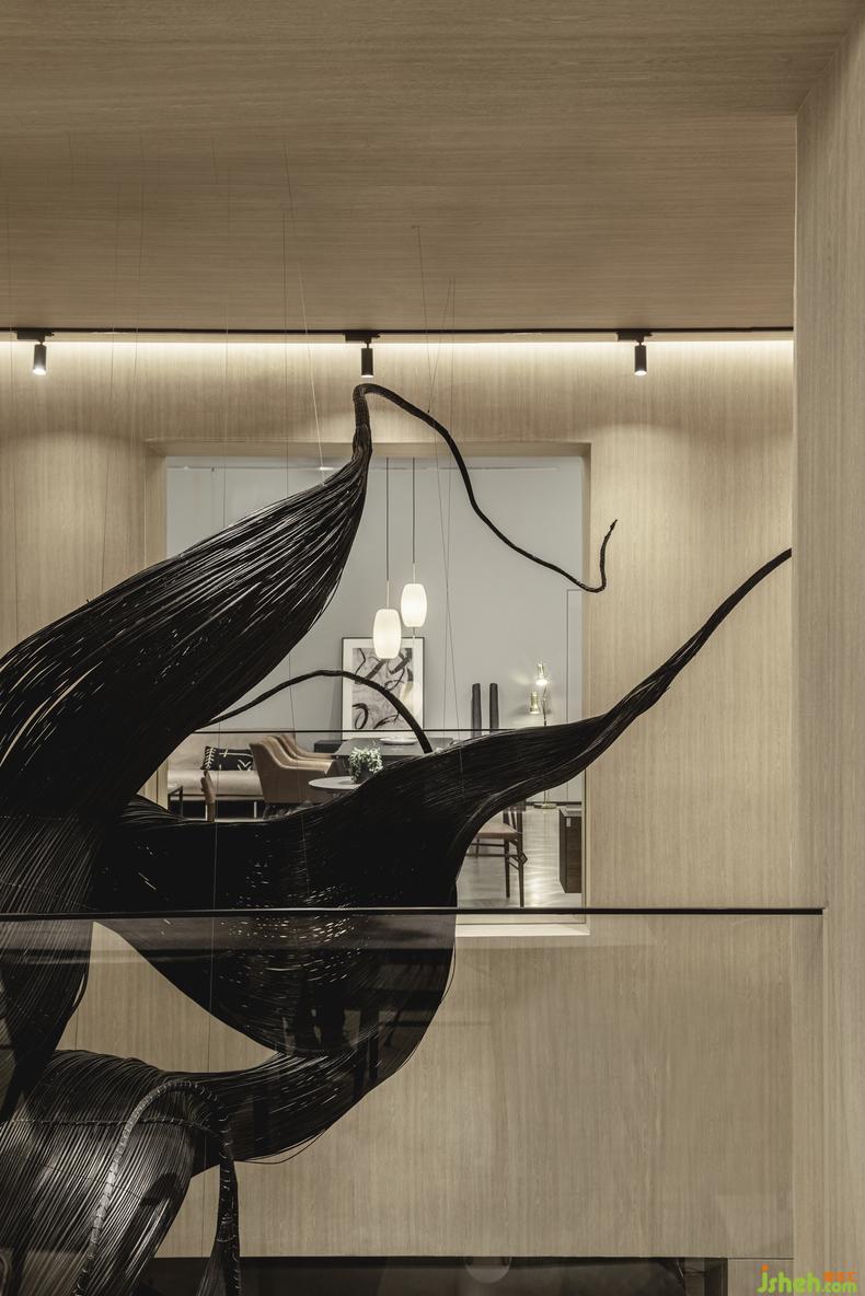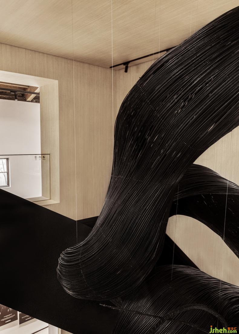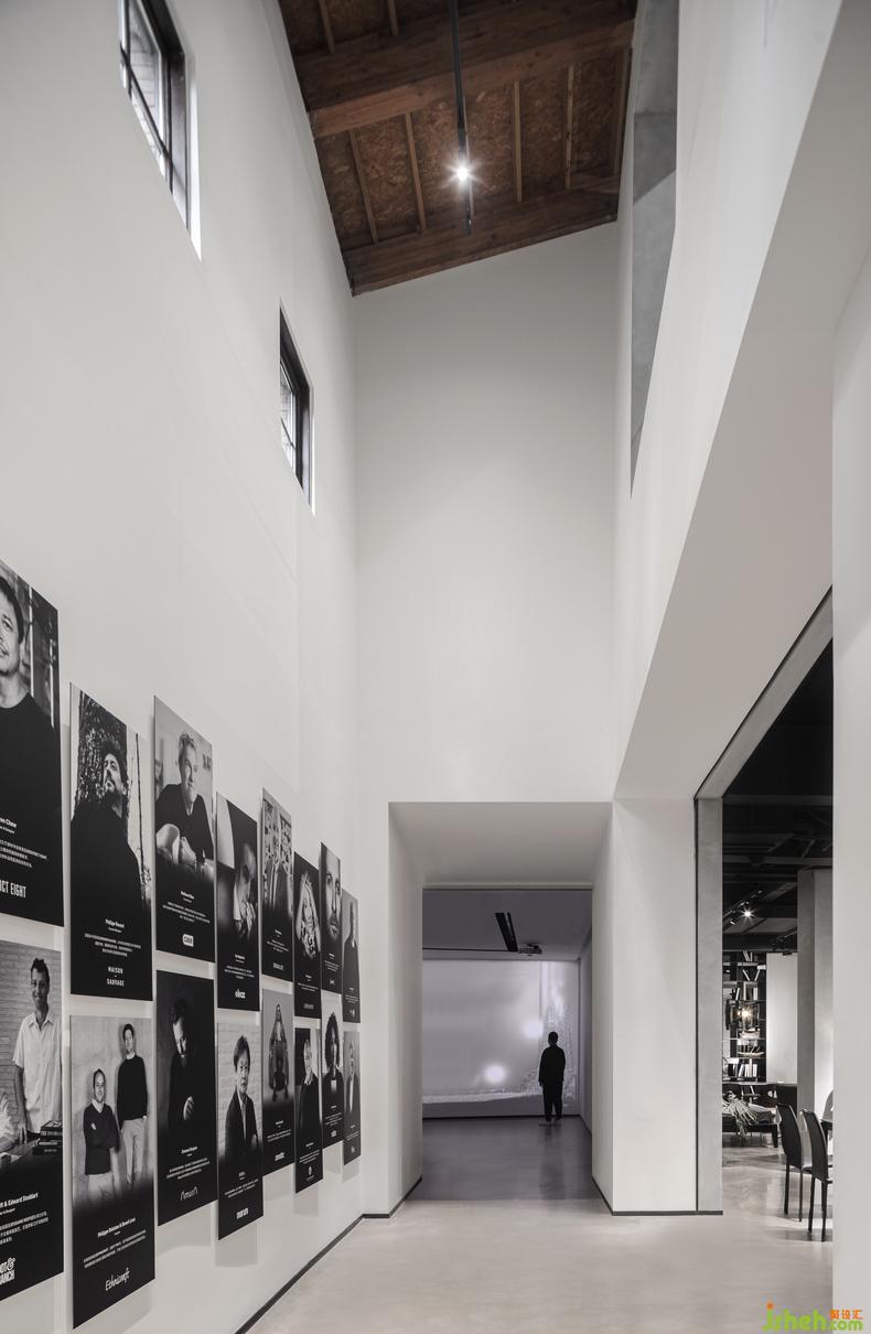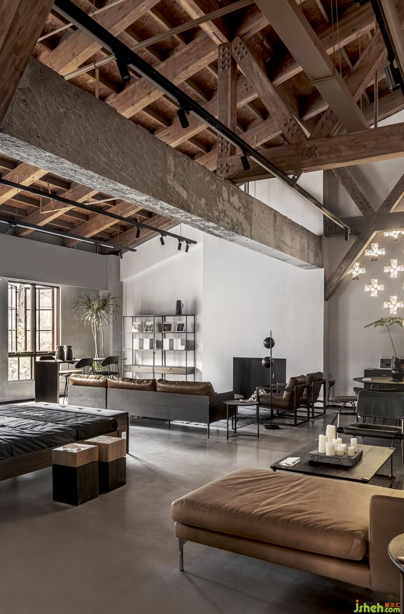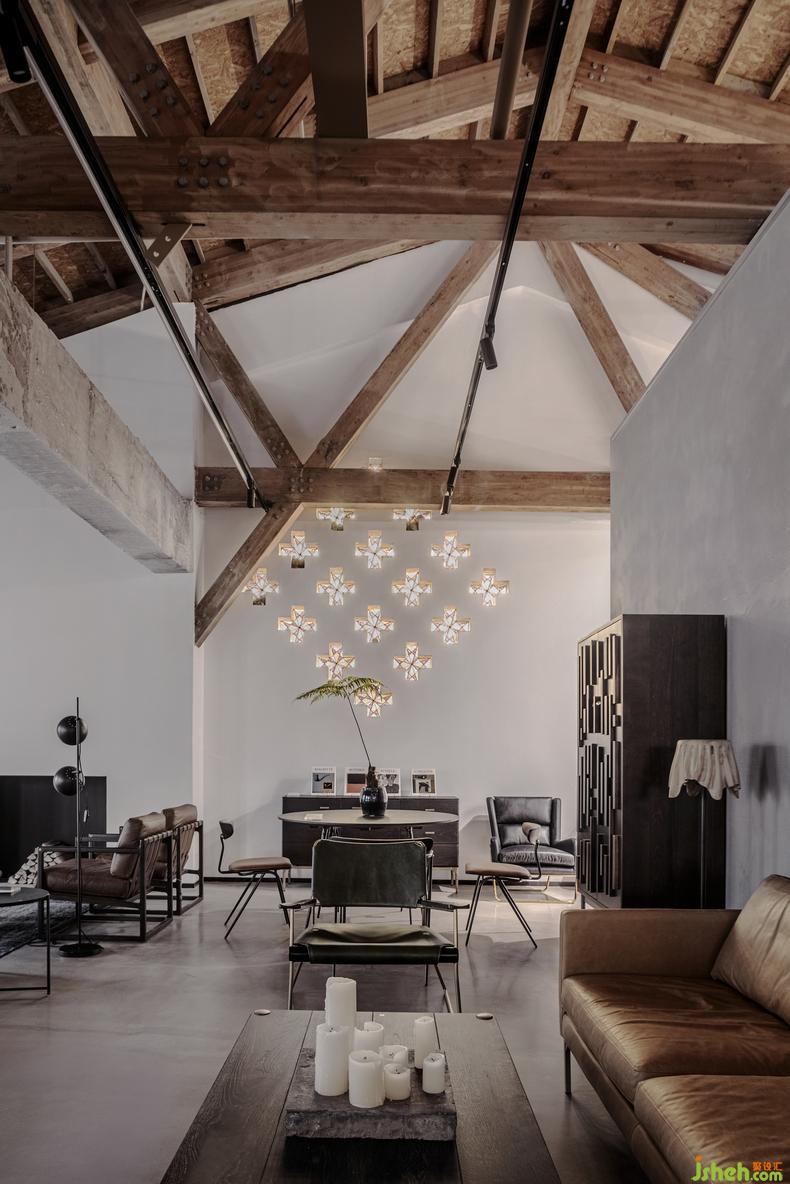 现代风格的家居展示空间与经过保护修复的桁架结构并存并形成强烈视觉冲击。展厅设计家居的色泽质感与桁架木色相呼应,光感的暗示使大跨度空间变得亲切。通过将材料质感与颜色关联,体现新与旧的融合,让整栋建筑拥有和谐统一的视觉感和空间感。