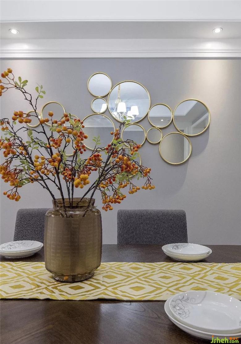 客厅和餐厅,都是深色的家具,墙面选择不同的装饰品,挂画比较温馨、镜面比较时尚,视觉上给人一种独特的美感,像一个天平,对家人的爱从不偏袒。