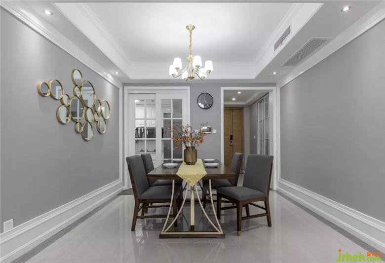 色彩厚重的餐桌将空间变得沉稳而令人安心,精致的美式吊灯无论造型还是质感,都具有浓烈的复古感,与墙面的装饰镜搭配,衬托出不一样的浪漫情愫。