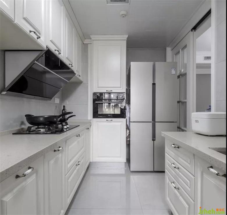 白色橱柜、浅色瓷砖,身在其中,让人心里都暖了起来。上下橱柜的设计,让物品分门别类摆放,干净的厨房也会让做饭人的心情变的舒畅,满溢着温馨之香。