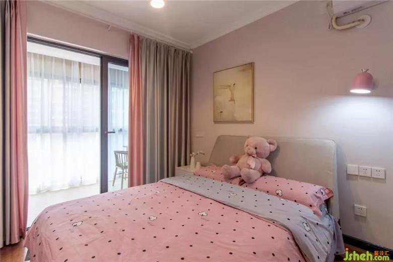 女儿的房间,装修公司以她喜欢的粉色为主,灰色粉拼接的窗帘、床头的粉色壁灯、粉色的床品,都洋溢着对女儿的宠溺。